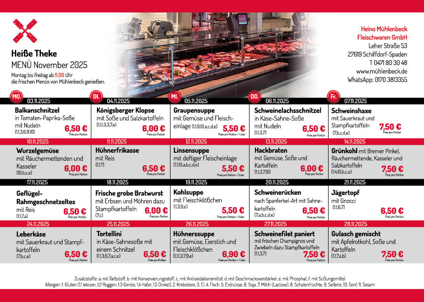 Unsere täglich frisch zubereitete Heiße Theke für diesen Monat Zum downloaden der Menüpläne klicken Sie hier auf den Monat: Dezember November